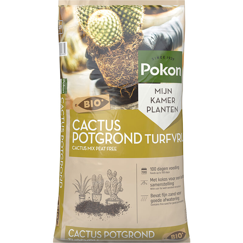 Pokon Potgrond Cactus Turfvrij is geschikt voor cactus- en vetplanten. In de vrije natuur groeien deze planten op plaatsen waar vaak maanden geen druppel water valt en het soms erg hard regent. Een goede voedingsbodem die aan de behoeften van de plant voldoet is daarom essentieel. Pokon Cactus Potgrond Turfvrij bestaat uit de beste en meest hoogwaardige grondstoffen zoals kokos. Deze grond is luchtig en goed waterdoorlatend door het toegevoegde zand, hierdoor kan je cactus- of vetplant water goed opnemen en afvoeren. Er zit daarnaast voldoende voeding in voor ca.100 dagen.