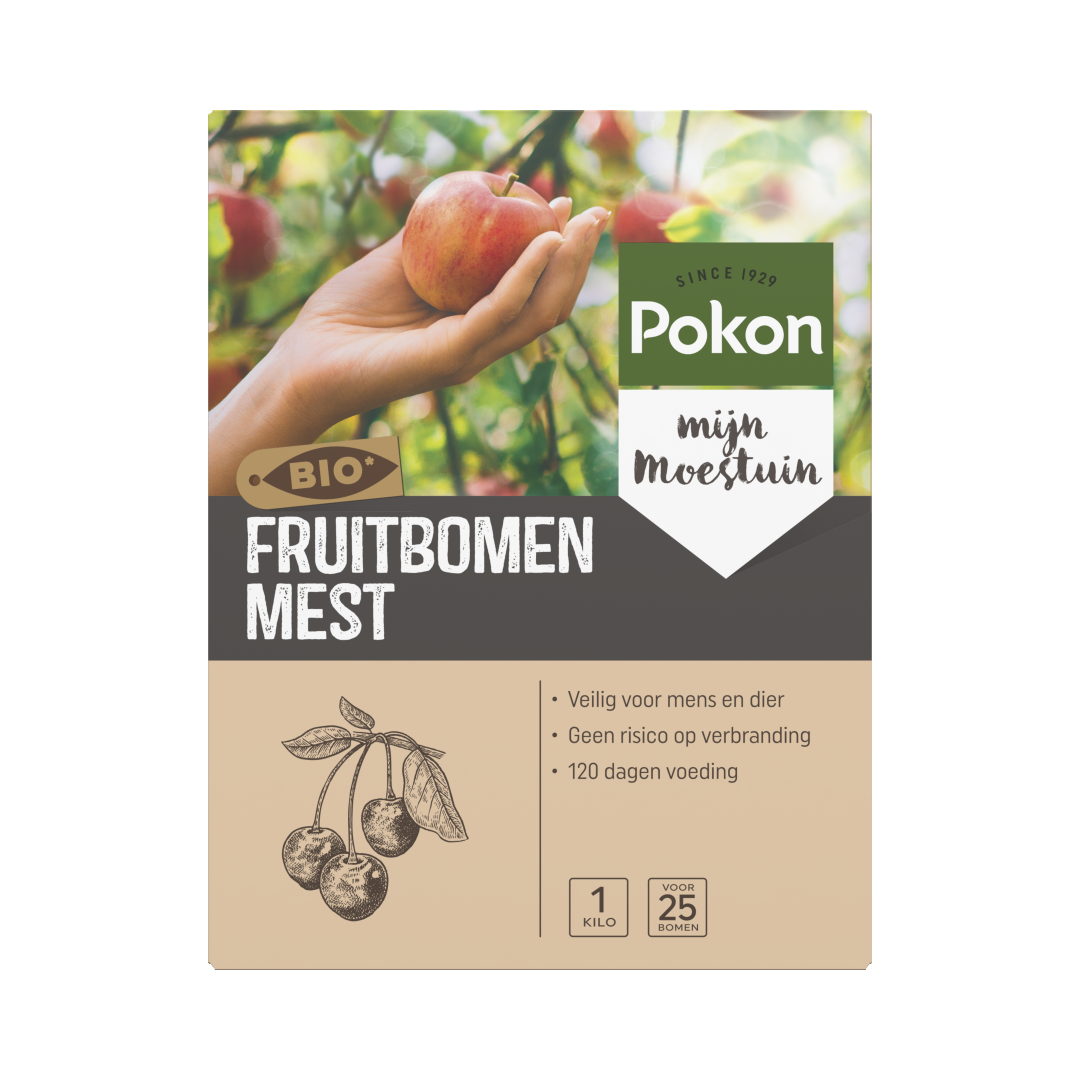 Deze biologische meststof is geschikt voor alle soorten fruitbomen. Pokon Bio Fruitbomen Mest is rijk aan kalium, wat zorgt voor sterke fruitbomen met kwalitatief betere vruchten. Een goed bemeste bodem is een belangrijke voorwaarde voor een goede oogst. Gezonde bomen hebben meer weerstand tegen ziektes en plagen. Pokon Bio Fruitbomen Mest geeft tot 120 dagen voeding en geeft geen risico op verbranding. Pokon Bio Fruitbomen Mest kan gedurende het hele jaar gebruikt worden. Voor het beste resultaat voed je je planten 2 keer per jaar, in het vroege voorjaar en in de zomer.