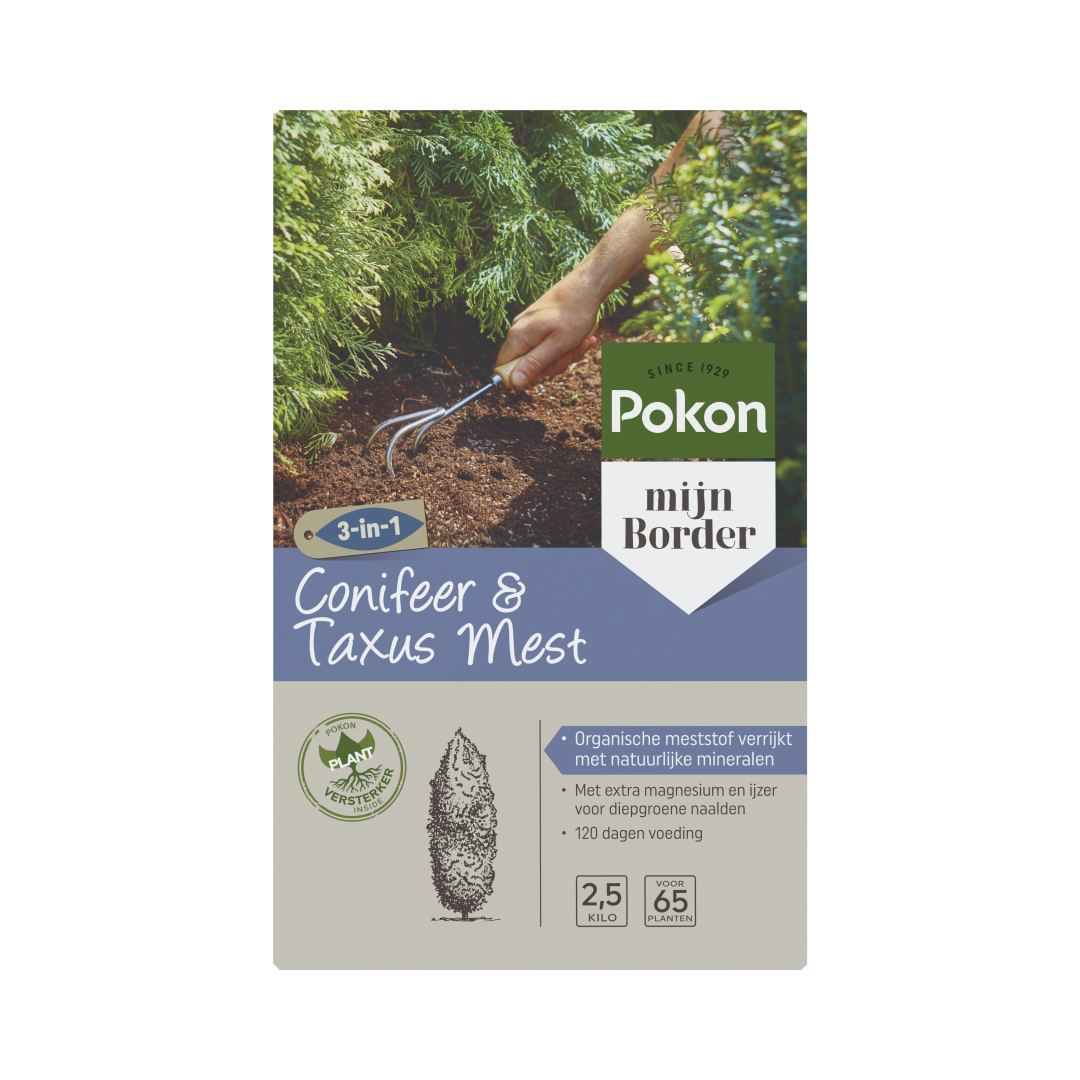 3-in-1 werking: voeding, bodemverbeteraar en plantversterker in 1 korrel. De organische mest van de Pokon Conifeer & Taxus Mest, verrijkt met in de natuur voorkomende mineralen zoals zeoliet en algen, voedt de plant en verbetert de grond. Een goed bemeste en gezonde bodem is een belangrijke voorwaarde voor mooie groene naalden en gezonde planten. Door de extra toevoeging van Magnesium (Mg0) en IJzer (Fe) krijgen de naalden een intense diepgroene kleur. De voeding en Pokon Plantenversterker zorgen voor sterke planten met een goede weerstand tegen ziektes, plagen en vorst. Pokon Conifeer & Taxus Mest geeft tot wel 120 dagen voeding. Pokon Conifeer & Taxus Mest kan in de maanden maart t/m augustus gebruikt worden. Voor het beste resultaat voed je je planten 2 keer per jaar, in het vroege voorjaar en in de zomer.
