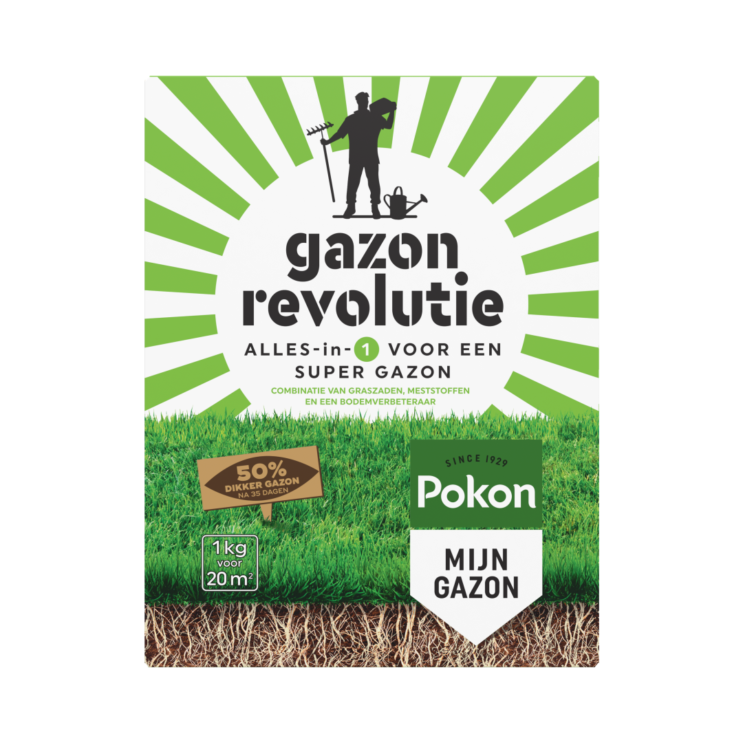 Pokon Gazon Revolutie is een natuurlijke combinatie van graszaden, meststoffen en een bodemverbeteraar waarmee je in één keer een dik en mooi gazon kunt kweken. Gebruik het om je dunne gazon weer vol en gezond te maken, waardoor onkruid en mos minder kans maken. Ook wordt het gazon groener in slechts 15 dagen en is Pokon Gazon Revolutie veilig voor kind, dier en omgeving. Pokon Gazon Revolutie is van maart tot en met november te gebruiken, wanneer de vorstperiode voorbij is en de buitentemperatuur hoger is dan 6 graden Celsius. Voor gebruik goed schudden om de inhoud van de verpakking goed te mengen. Breng Pokon Gazon Revolutie direct aan nadat het gazon is voorbereid. Blijf het gazon 2 x per dag besproeien gedurende de eerste 2 weken. Houd het gazon vochtig om de ontkieming van zaden te ondersteunen.