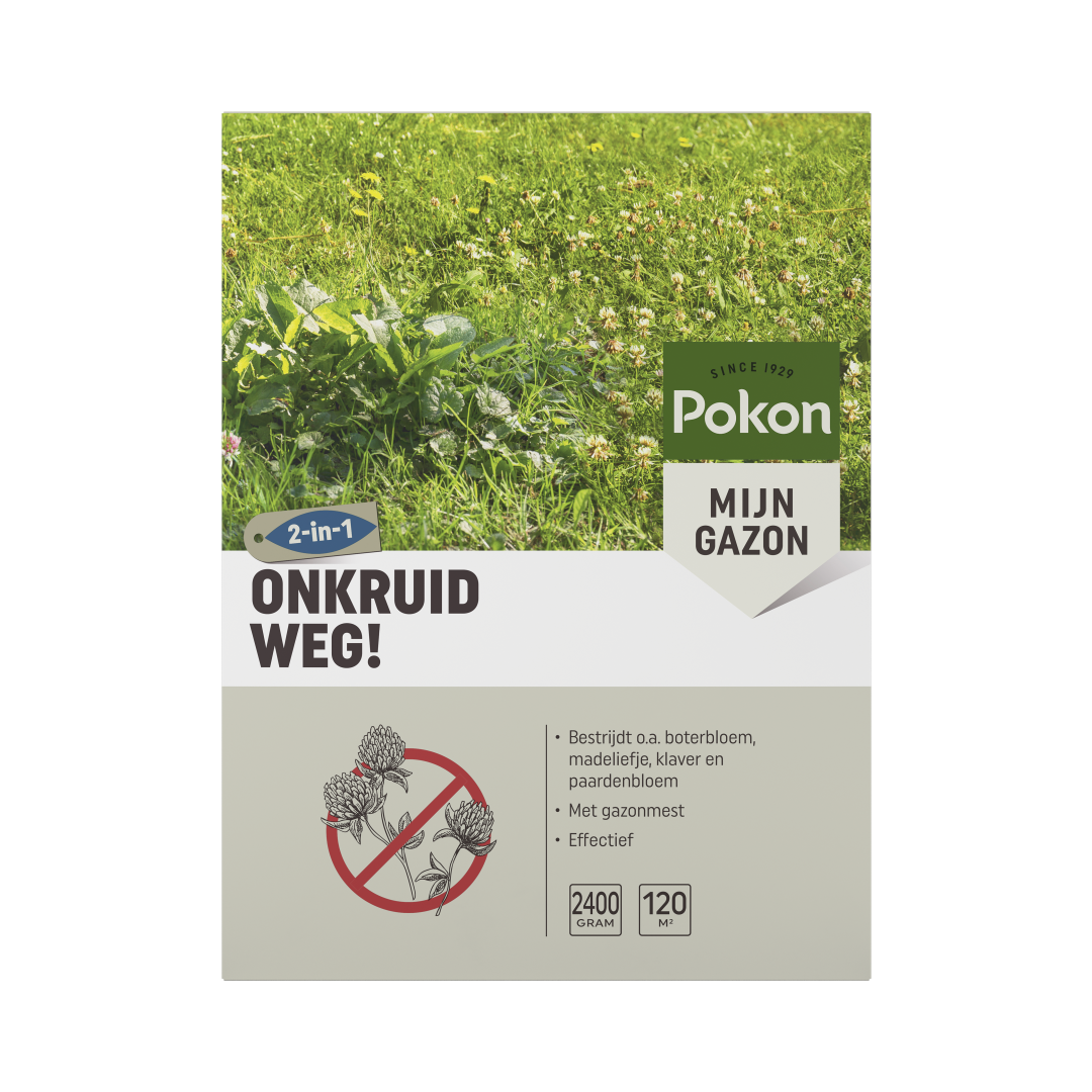 Last van onkruid in je gazon? Pokon Onkruid Weg! is een effectieve manier om dit probleem op te lossen. Met deze onkruidbestrijder, die bovendien gazonmest bevat, wordt onkruid verwijderd en je gazon direct gevoed. De gazonmest bevat essentiële voedingsstoffen die ervoor zorgen dat je gazon beter bestand is tegen onkruid. Onkruid kun je het beste behandelen in de periode maart t/m september. Voor een optimale behandeling is het belangrijk dat de grond niet is bevroren, dat er geen zware regen wordt verwacht en dat de buitentemperatuur niet te hoog is (het gras kan verbranden). Maai het gazon de eerste 4 dagen na toepassing niet. Na het behandelen van onkruid kunnen er kale plekken ontstaan. Met Pokon Kale Plekken Hersteller heb je snel weer een egaal, groen gazon.