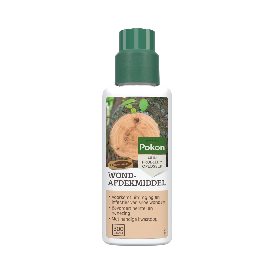 Pokon Wondafdekmiddel is een gebruiksklaar wondafdekmiddel dat snoeivlakken op fruit- en sierbomen beschermt als gevolg van o.a. snoeien, vorstinwerking, vraat of stormschade. Pokon Wondafdekmiddel bestaat uit 100% natuurlijke grondstoffen, die de boom normaliter voor eigen bescherming gebruikt. Het zorgt voor een elastische film die de snoeiwond beschermt tegen uitdroging en de genezing bevordert. Verder voorkomt het infectie door schimmels, bacteriën en virussen. Pokon Wondafdekmiddel hecht zich stevig aan het hout, loopt niet uit bij hitte en brokkelt of scheurt niet bij kou. Kleurverandering mogelijk, het is een natuurproduct. Niet toepassen bij regenachtig of koud weer (>5 graden Celsius).